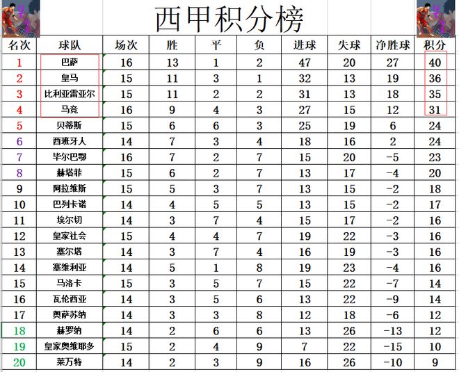 积分榜方面,巴萨先赛赢球继续连胜,他们又暂时将领先皇马的优势扩大到4分,比利亚雷亚尔也保持不错的状态,他们也是豪夺6连胜,1分之差紧追皇马稳居第3。马竞4天内遭遇2连败,开始从争冠队列中掉队,已经是落后榜首的巴萨9分。